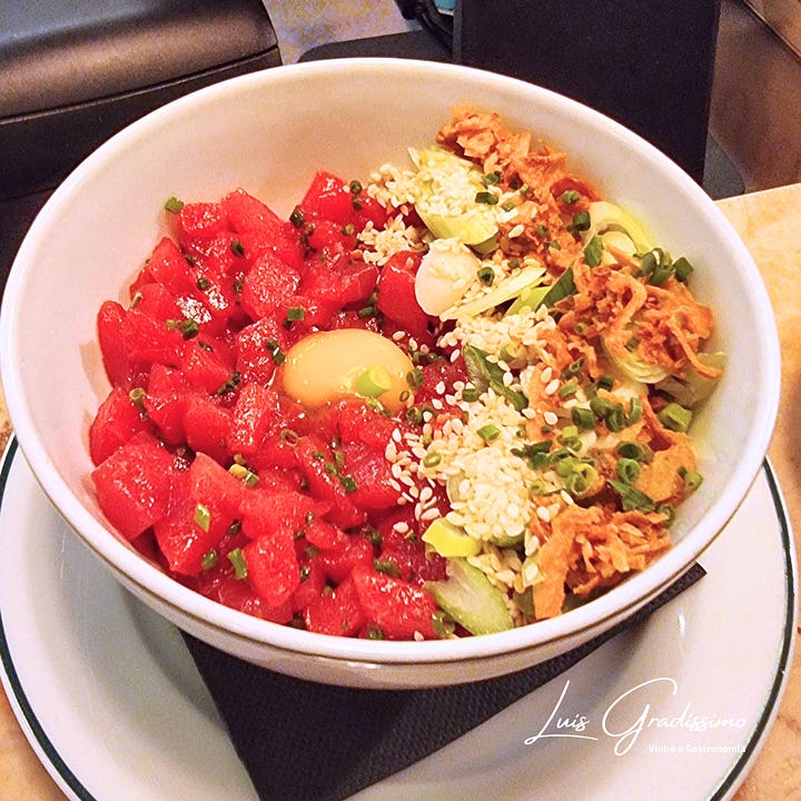 Para terminar as “entradas”, seguiu-se o Tártaro de atum rabilho, acompanhado de arroz, teriyaki, cebola frita e cebolinho, um belíssimo atum.