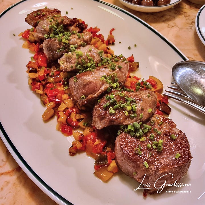 Por fim, um prato de carne, os Lombinhos de porco e picadinho de verão, uma carne macia, levemente caramelizada.
