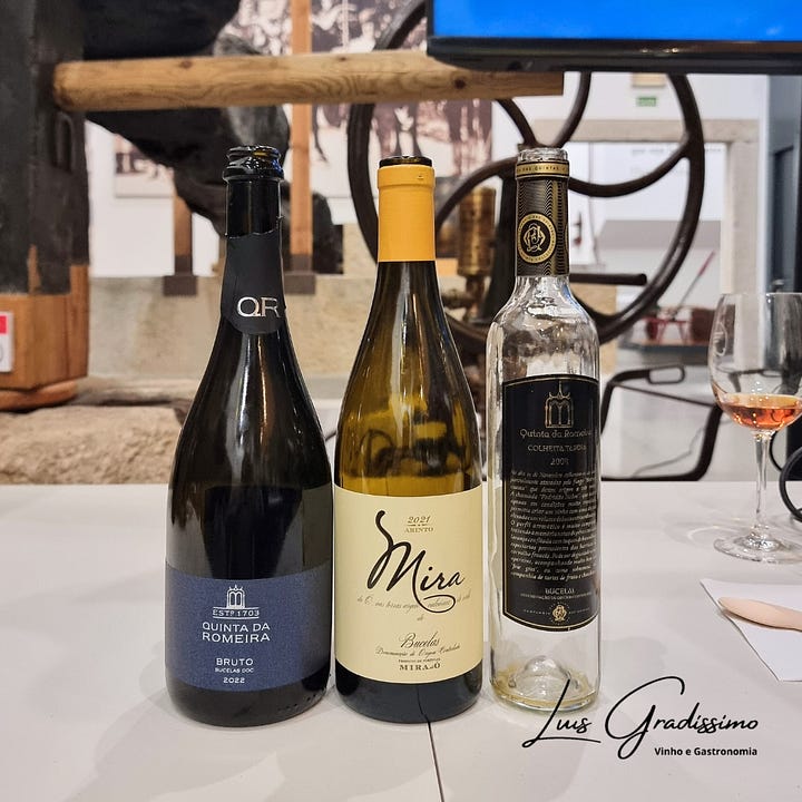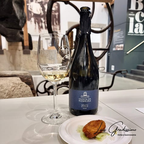 O primeiro vinho a ser servido foi um espumante bruto da Quinta da Romeira, bem seco, de acidez pronunciada, com carácter cítrico pronunciado, jovem, vivo, para harmonizar com um pastel de bacalhau. Uma conjugação com várias ligações, tanto a nível da textura (crocância da bolha com o estaladiço da fritura) mas sobretudo com o contraste da acidez do vinho com a gordura da confecção.