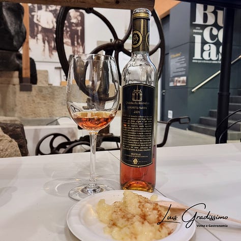 Por fim, um momento dedicado aos doces, com uma ligação de conforto entre um vinho doce e uma sobremesa. O vinho era uma colheita tardia de 2004, com uma evolução notória no aroma e na cor, um vinho doce, cremoso, com uma boa dose de acidez. A ligação não foi perfeita mas foi funcional em vários aspectos, faltou o carácter mais fresco e cítrico no vinho (teria de ser uma colheita tardia mais jovem) para ligar melhor ao limão do arroz doce…